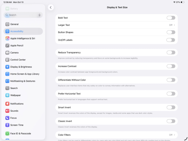 To turn off the Liquid Glass view in iPadOS, head to your iPad’s Settings app and enter Accessibility from the list on the left. Tap on Display & Text Size, then toggle on the ‘Reduce Transparency’ option in here to remove the Liquid Glass effect:
