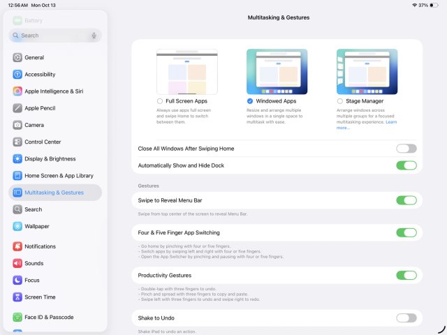 Find and tap on Multitasking & Gestures and then toggle on Full Screen Apps. This returns the system to previous iPadOS behaviour where you can swipe up from the bottom of the screen to minimise apps, or swipe up and hold to switch between them. Read more about Multitasking in iPadOS 26 in this Apple article .