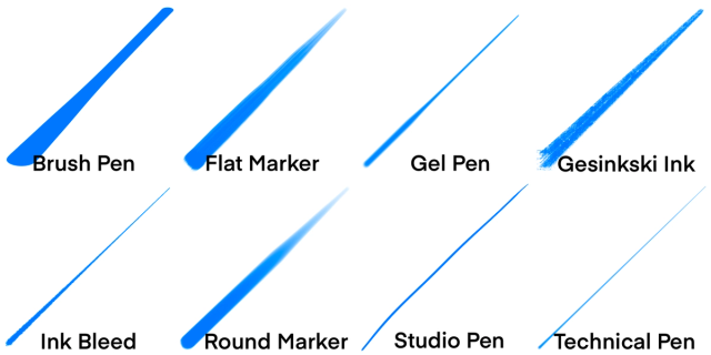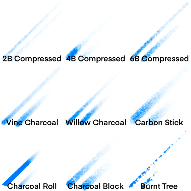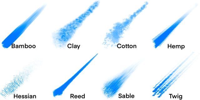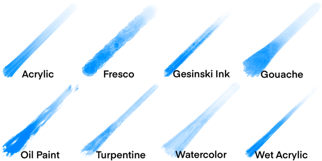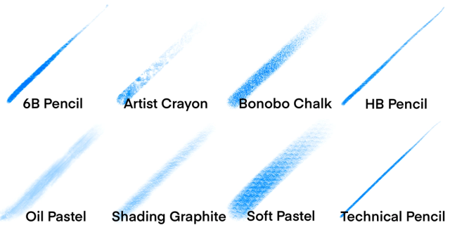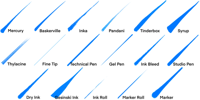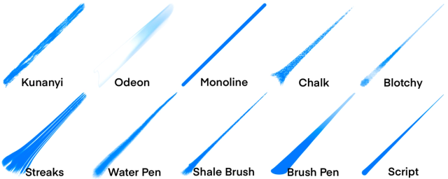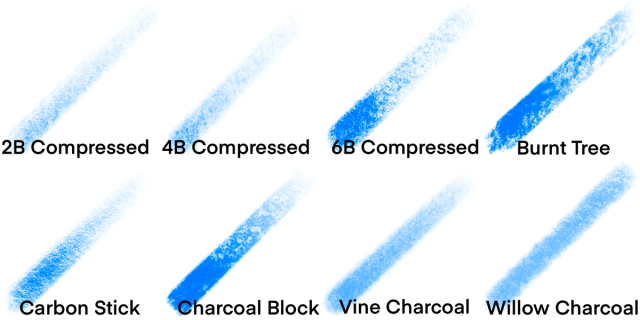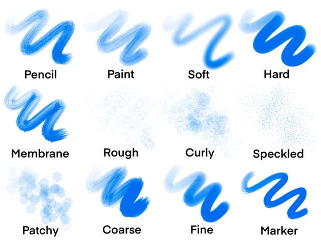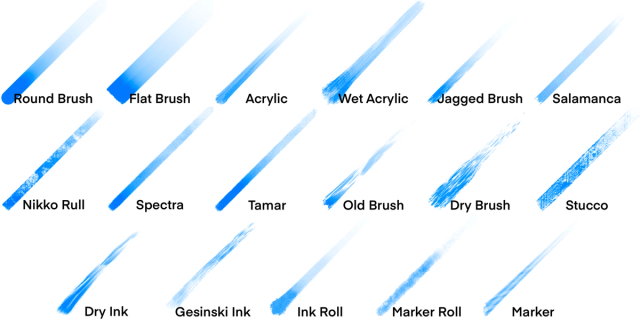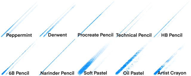 Here is an updated list with previews that includes brushes from original Procreate up until version 5, wherever significant brush changes were made.