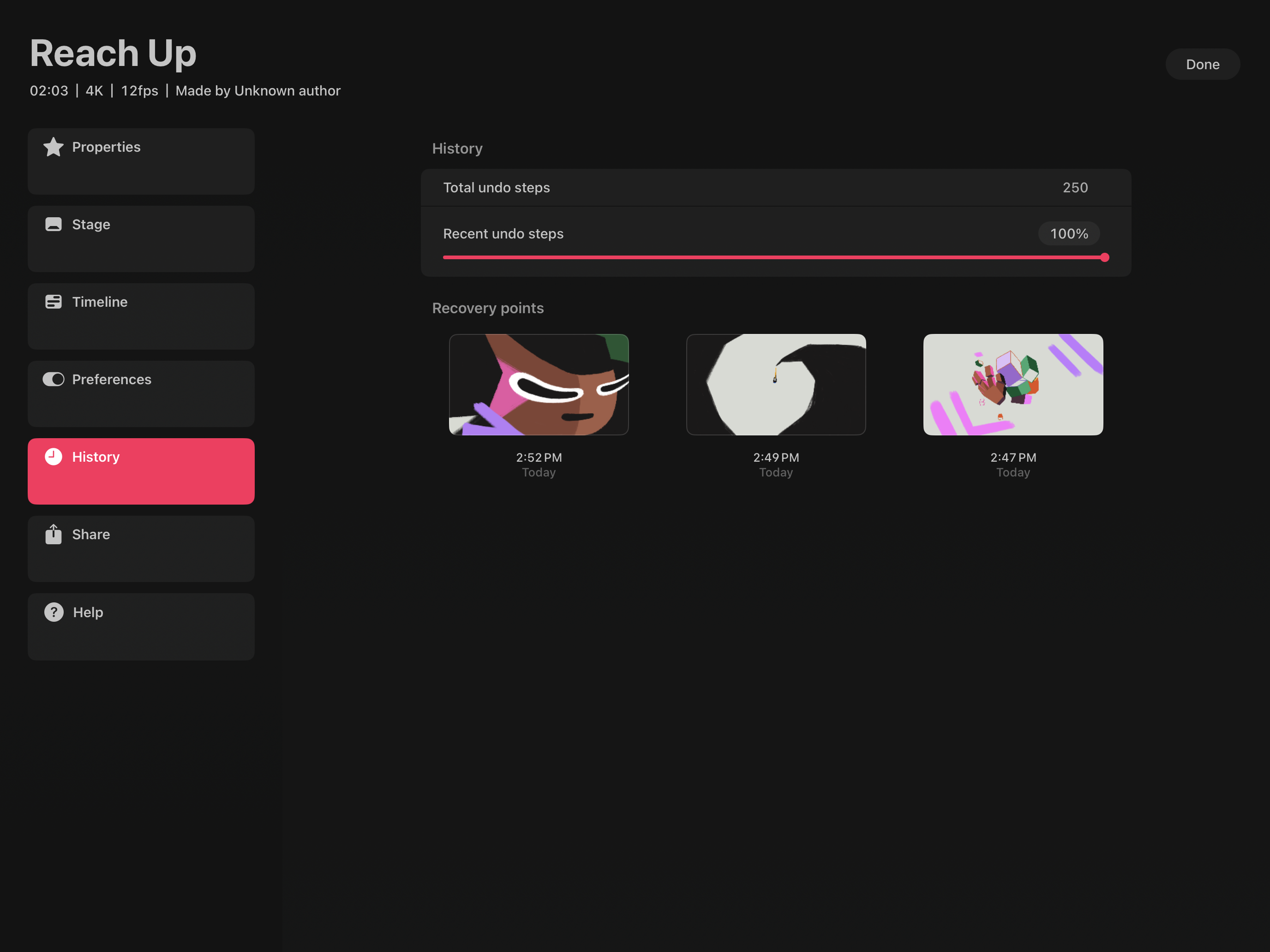 By default, Procreate Dreams stores 250 undo steps. You can adjust the total of undo steps stored inside your file in Movie Settings → History → Total undo steps. You can set your Total undo steps between 10 to infinite . Setting your Total undo steps to infinite means you store every change you make within that .drm file.