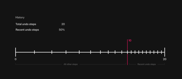 For example, with Total undo steps set to 20 and Recent undo steps at 50%, you initially go back one undo step at a time for each undo until you reach 10 steps.