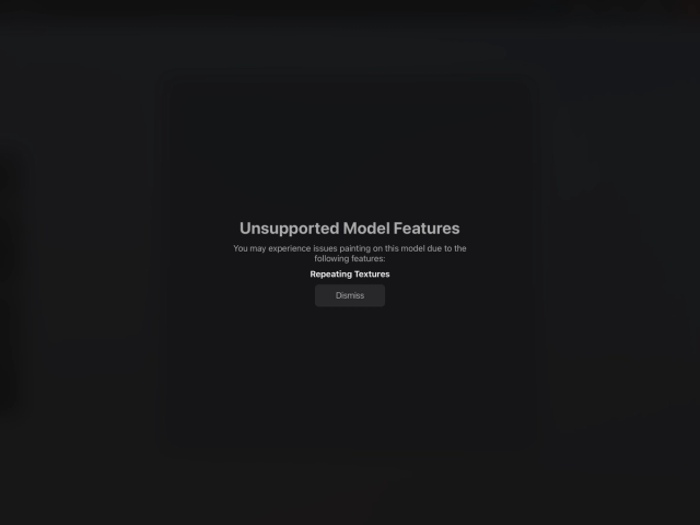 If your UV map is not well aligned or repeating on a section of your model, Procreate will alert you with the message, ‘Unsupported Model Features — you may experience issues painting on this model due to the following features: Repeating Textures’.