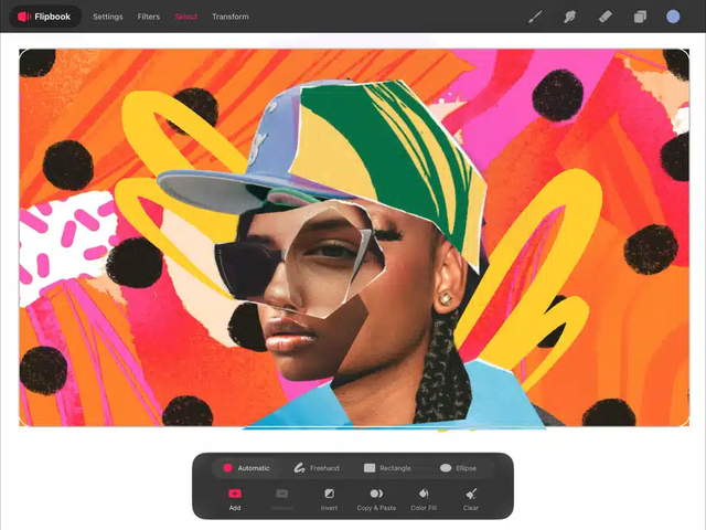 Found in the Select tool in Draw & Paint when working in a Drawing or Flipbook, Automatic Selection allows you to tap on a color to automatically select that color and similar ones that border it: