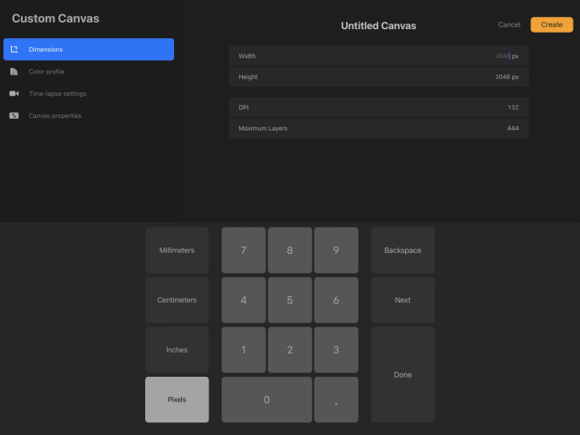 Further customize your new canvas by adjusting Color profile, Time-lapse settings, and canvas properties.