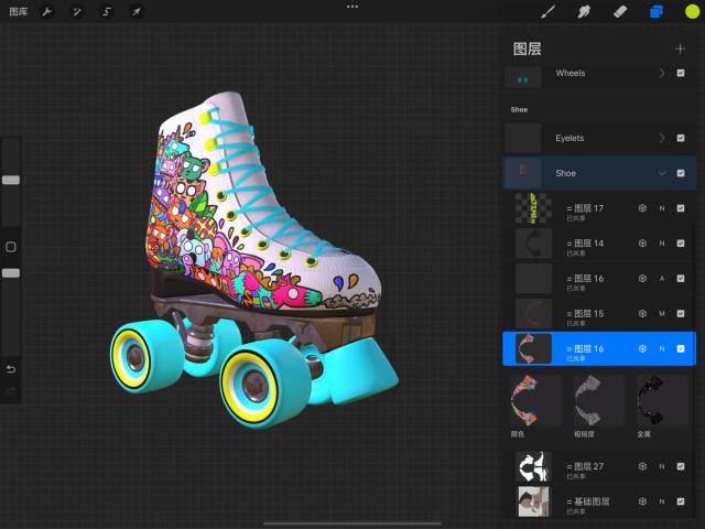 点击材质以查看和绘制 3D 物件图层中的各个基本颜色、粗糙度和金属材质。