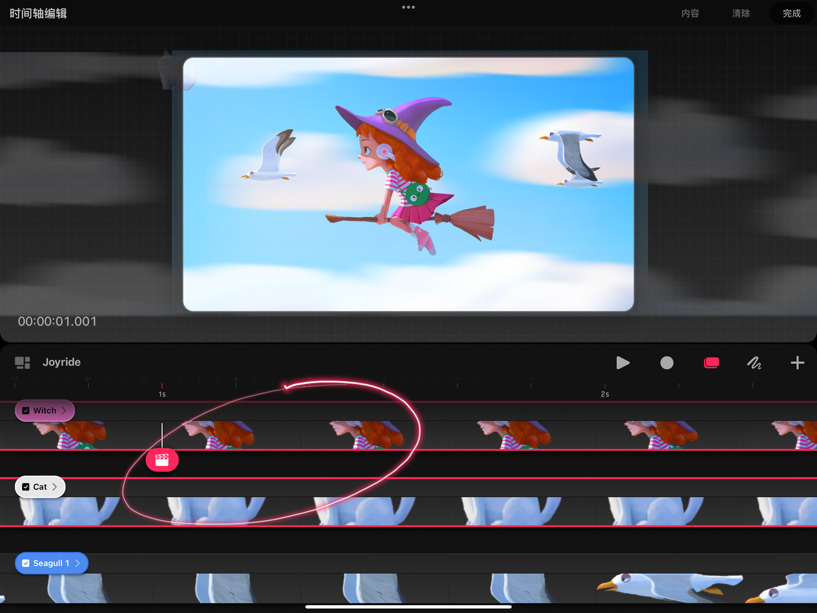 时间轴编辑用 Apple Pencil 在选区中添加和删除多个内容。在时间轴编辑模式下,使用 Apple Pencil 在时间轴上绘图会留下一条发光的红色光迹,以显示你已选择的内容。