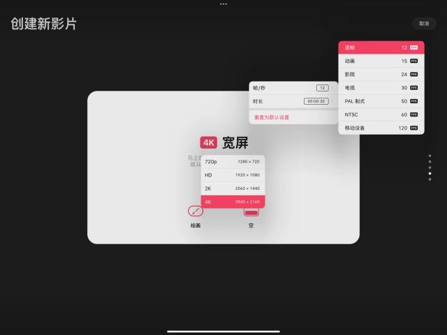 Procreate Dreams 提供了一系列一般性的屏幕尺寸和分辨率,以便你可以直接开始创作。你可以编辑这些预设中的任何一项来创建自定义的电影尺寸。