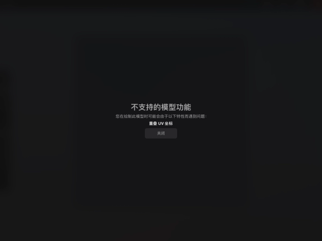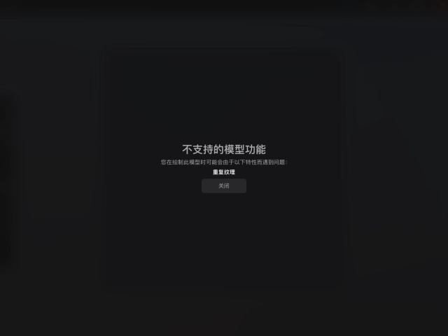 如果模型的 UV 贴图未正确对齐,或者在模型的某个部分存在重复,Procreate 会提示信息 “不支持的模型功能—您在绘图此模型时可能会由于以下特性而遇到问题:重复纹理”。