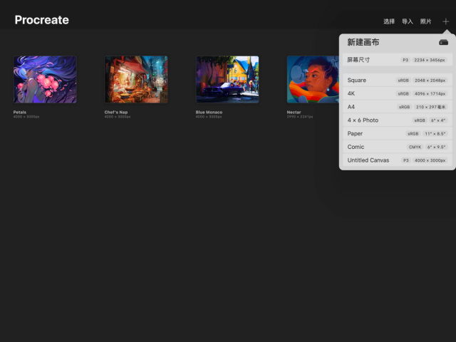 从列表中选择一个预设画布,屏幕尺寸是一个很好的起点。请注意,每个预设都会显示其尺寸和颜色配置文件。