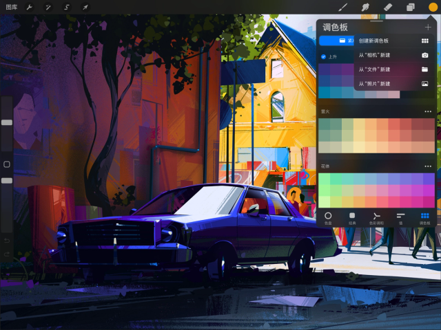 Procreate 预装了一些很棒的色彩调色板,可以让你轻松起步。你还可以将自己或其他艺术家创建的色彩调色板导入为 .swatches、.ase 和 .aco 文件。