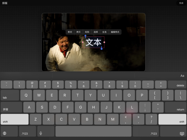 双点文本可打开内文菜单,其中包含剪切、复制、粘贴、选择、全选和编辑样式选项。