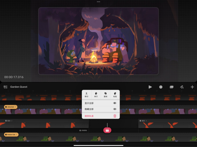 你创建并导入 Procreate Dreams 的所有内容都会显示在轨道上。可使用以下选项来编排电影、添加剪辑蒙版并应用混合模式。