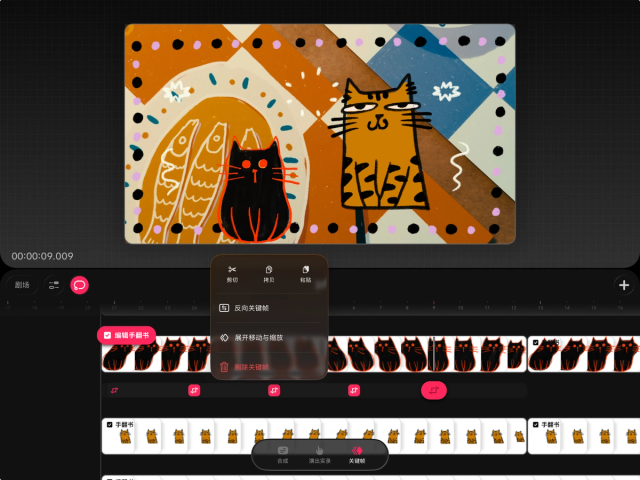 你也可以同样轻松地将相同的关键帧应用到下一个黑猫手翻书。只需将播放头设置在其开头,然后轻点并按住内容并选择“粘贴”。