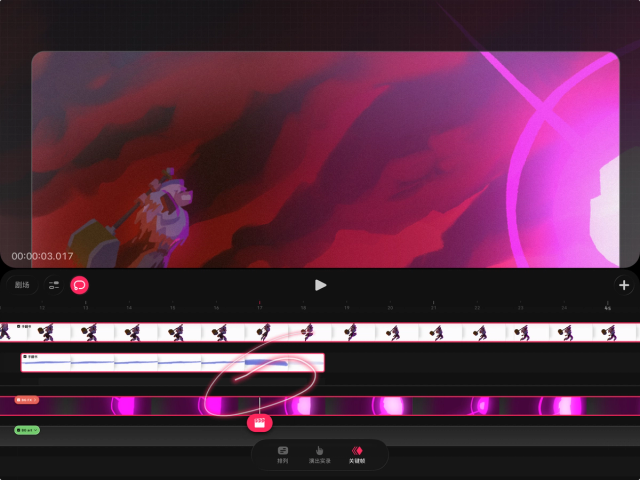 多选功能配合 Apple Pencil,可以将多个内容片段或整个轨道添加到选区,或从中移除。在多选模式下,使用 Apple Pencil 或手指在时间轴上画圈,会留下一道发光的红色轨迹,显示你已选中的内容或轨道。