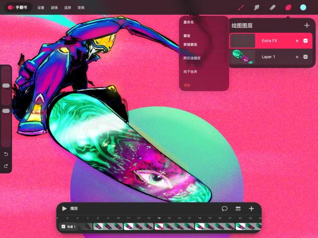 在父级图层下方添加一个图层蒙版。图层蒙版通过灰度进行编辑,擦除或用黑色绘画会隐藏父级图层的部分内容,用白色绘画则会显示内容。不同深浅的灰色会以相应的不透明度影响内容。图层蒙版还可以反转,以达到与原蒙版相反的隐藏或显现效果。要了解更多关于图层蒙版的信息,请查看 《Procreate 使用手册》 。