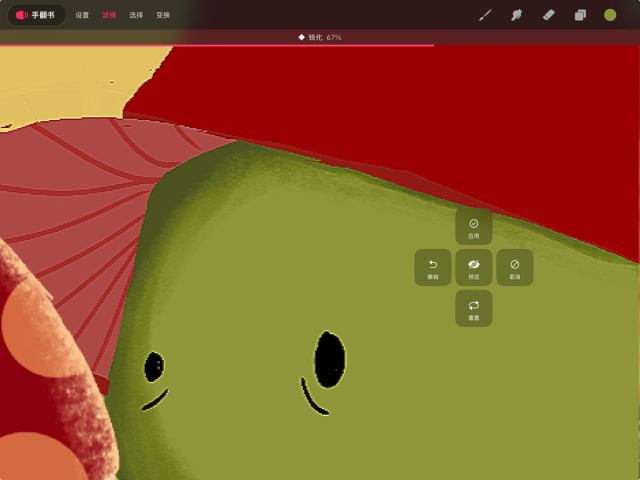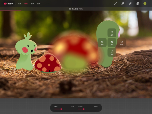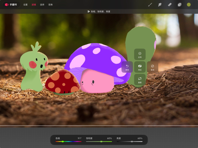 除了色相、饱和度、亮度之外,所有滤镜都可以通过在画布上左右滑动来调整效果强度。轻点画布上的任意位置即可调出菜单,其中包含以下选项: