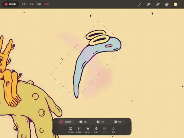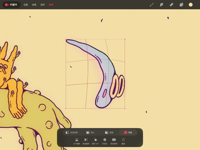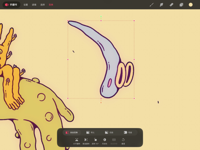 变换工具可在绘画与绘图模式下使用。你可以使用此工具对绘图图层、手翻书图层或选区进行重新定位、旋转、缩放、拉伸、剪切、倾斜和弯曲操作。