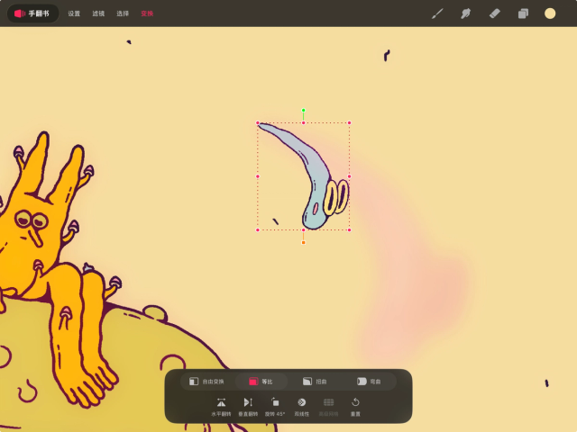 在绘画与绘图模式下,轻点界面顶部的“变换”按钮即可进入变换模式,随时再次轻点该按钮即可退出。当你进入变换模式时,系统默认会设置为“等比”模式,并且你会在内容周围看到一个边界框。