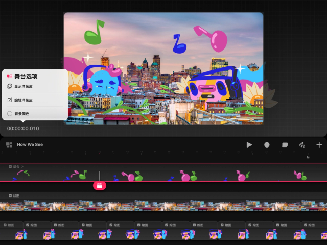 舞台会在你进行制作和回放时显示你的作品。舞台尺寸是在你创建电影时设置的,并且可以稍后在 电影设置 中进行更改。