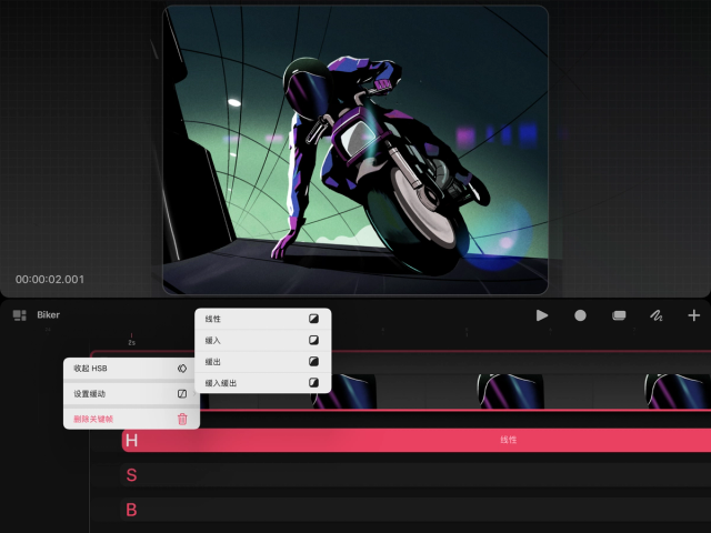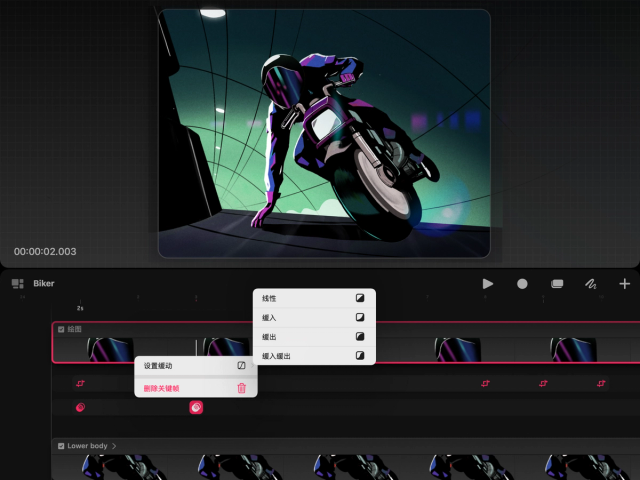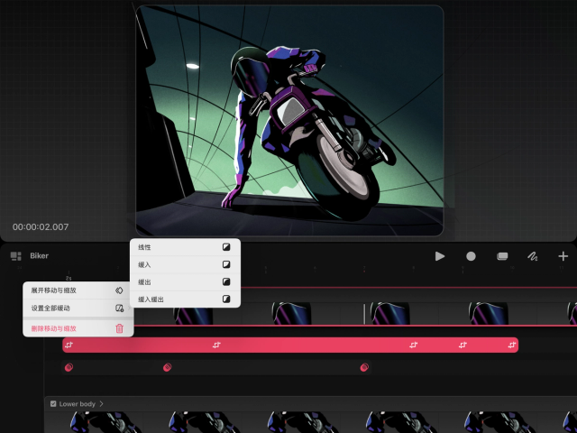 缓动通过影响动画的速度和时间来改变动画的外观和感觉,从而实现更自然的动作。Procreate Dreams 自带一些常用的缓动曲线,可帮助你为动画带来更多有机动作。