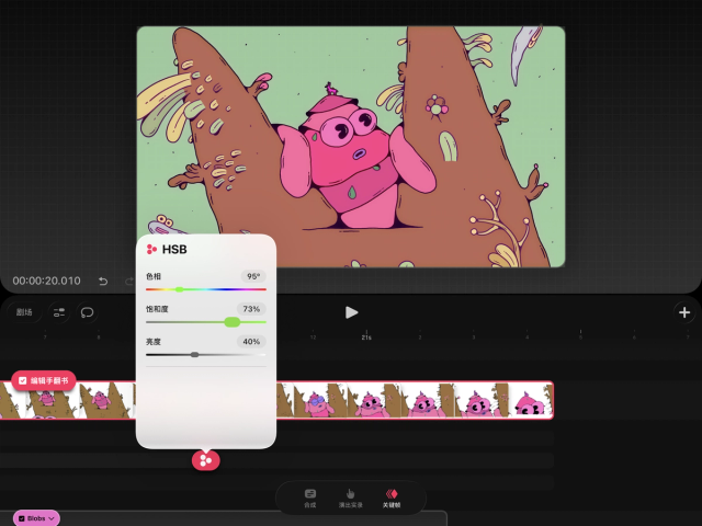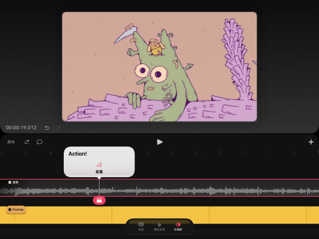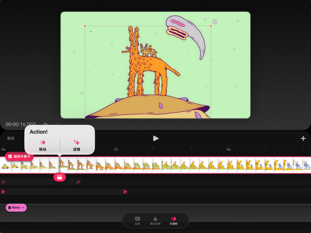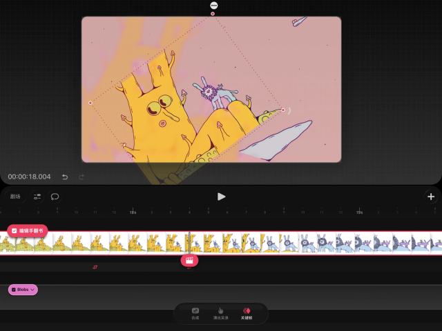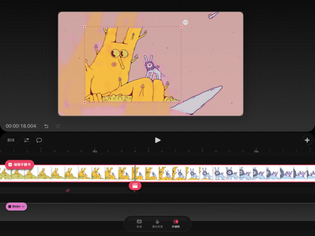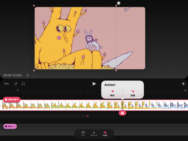 要在 Procreate Dreams 中操作和创建关键帧,你必须进入关键帧模式。在影片编辑界面,轻点时间轴底部的“关键帧”字样即可进入该模式。