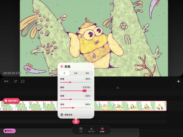 延伸:通过第三个 Z 平面上下移动杂色。虽然 Procreate Dreams 的杂色在屏幕上看起来是二维的,但它是在类似立方体的三维空间中生成的。滑动“延伸”将穿过 Z 轴上杂色的第三维度。