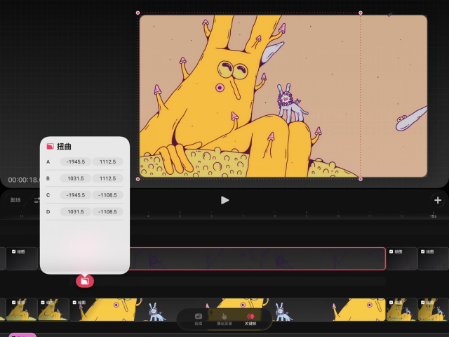 设置一个“扭曲”关键帧,然后轻点并拖动边界框上的任一角节点,即可对物体进行扭曲。