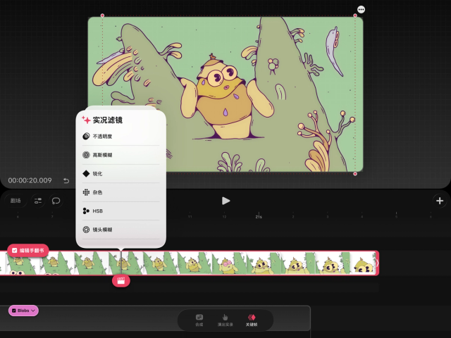 轻点“移动”以添加动作、弯曲或扭曲关键帧。轻点“滤镜”以添加不透明度、高斯模糊、锐化、杂色、HSB 或镜头模糊关键帧。