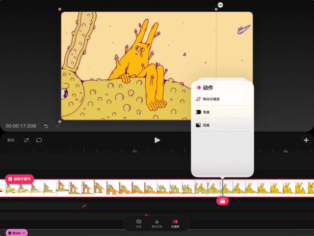 关键帧能让你的内容在两个时间点之间产生动作变化。在 Procreate Dreams 中,关键帧是一种无需逐帧绘制即可制作动画的灵活且简单的方式。在动画术语中,这被称为“补间”,即自动生成两个关键帧之间“中间帧”的过程。你可以使用不同类型的关键帧来创建运动并为内容添加特效。
