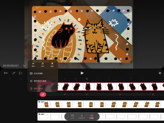 你也可以同样轻松地将相同的关键帧应用到下一个黑猫手翻书。只需将播放头设置在其开头,然后轻点并按住内容并选择“粘贴”。