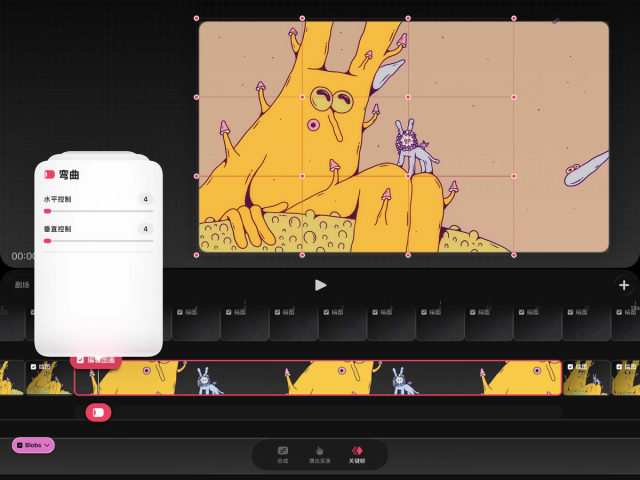 设置一个“弯曲”关键帧,然后拖动弯曲网格中的任意节点来弯曲内容。