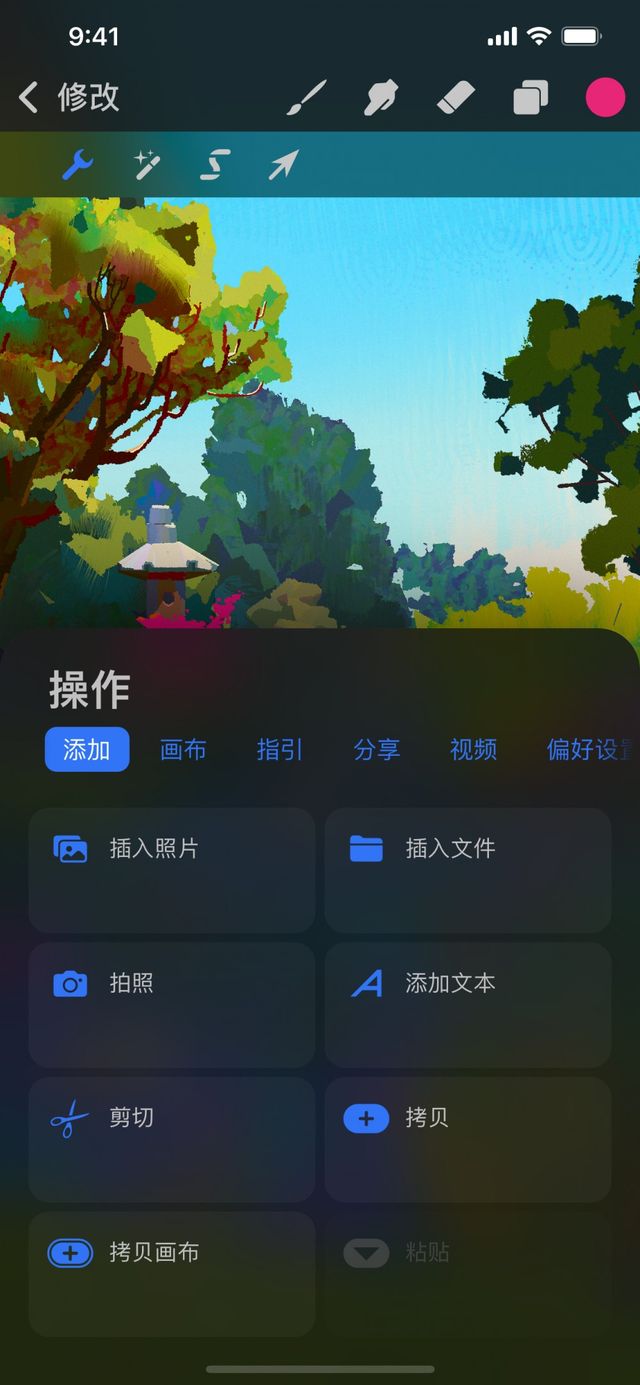 在 Procreate Pocket 界面左上方轻点 修改 后,你会看到以扳手图标代表的 操作 按钮。