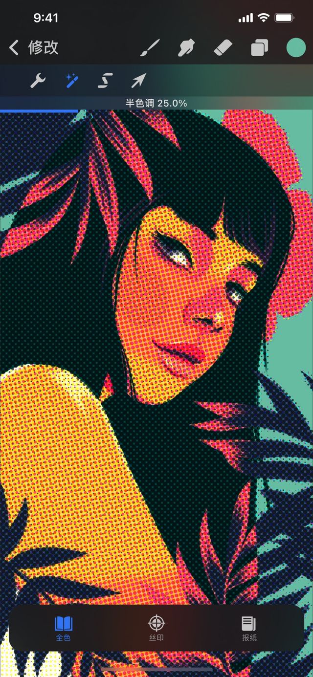 轻点 修改 > 调整 > 特效 > 半色调 进入半色调界面。