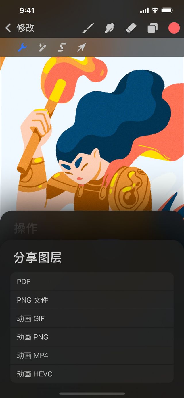 轻点 修改 > 操作 > 分享 > 分享图层 > 动画MP4 以呼唤 动画MP4 界面。