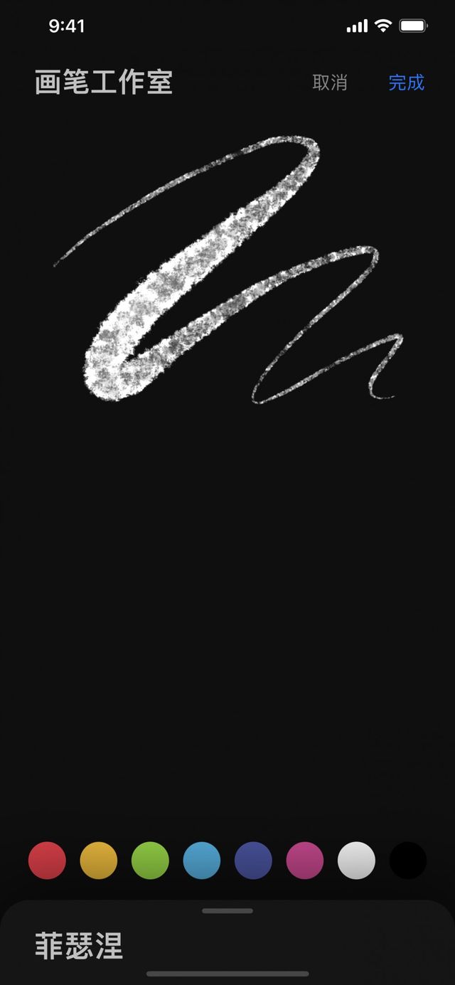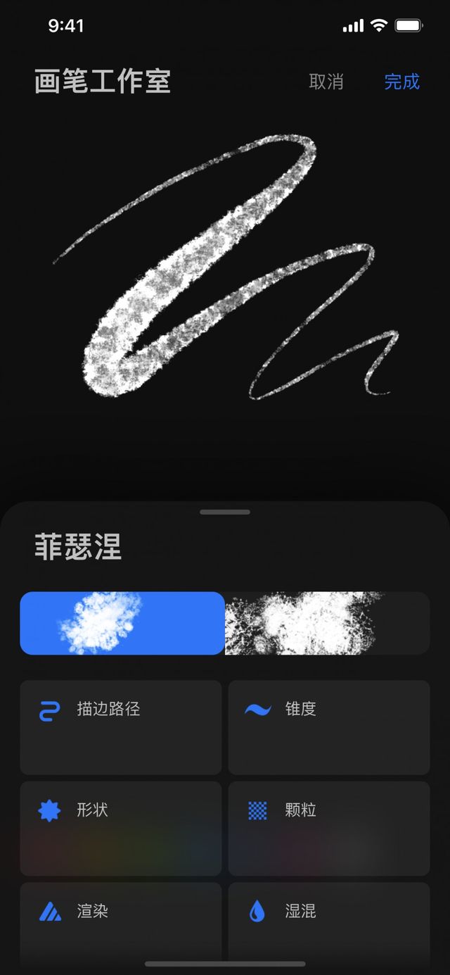 你可以用两个方式进入 画笔工作室:轻点一支现有画笔对它进行编辑,或从画笔菜单中轻点 新画笔。两种方式皆会进入同个画笔工作室界面,差异在于:导入 按钮只有在你以轻点 新画笔 按钮进入画笔工作室时才会出现可用。
