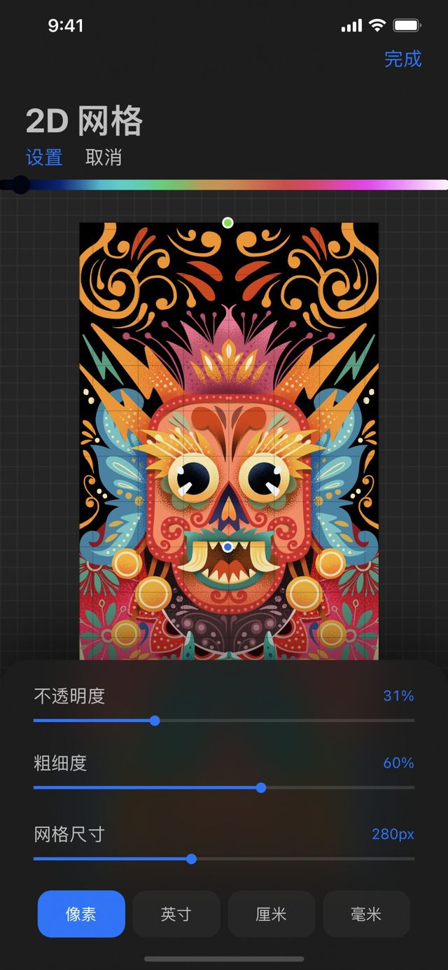 设置 2D 网格 及 等大 模式中的网格大小;你可以调节滑动键,或直接轻点数值栏并输入精准网格尺寸。