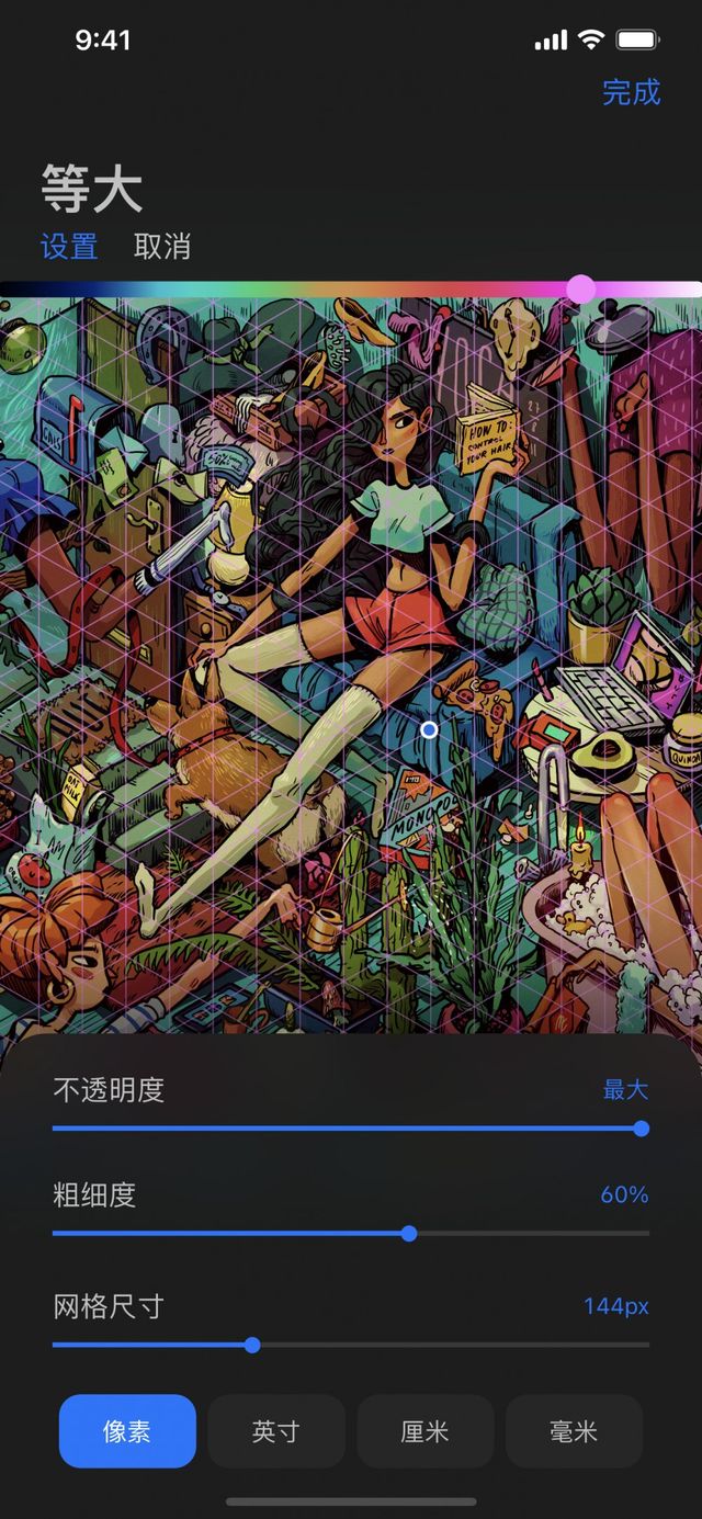 从 修改 > 操作 > 指引 轻点 等大 来启用 等大指引;轻点 指引设置 进入 绘图指引 界面并能编辑指引网格。