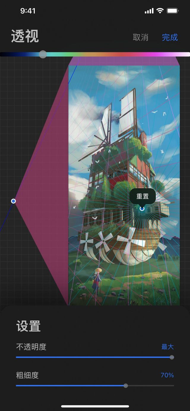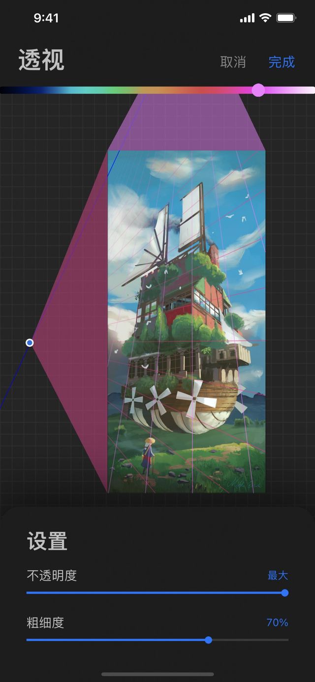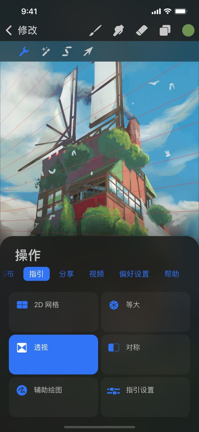 从 修改 > 操作 > 指引 轻点 透视 来启用 透视指引;轻点 指引设置 进入 绘图指引 界面并能编辑指引网格。