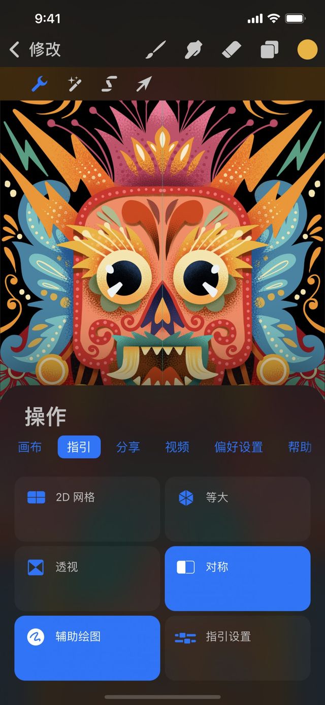 从 修改 > 操作 > 指引 轻点 对称 来启用 对称指引;轻点 指引设置 进入 绘图指引 界面并能编辑指引网格。
