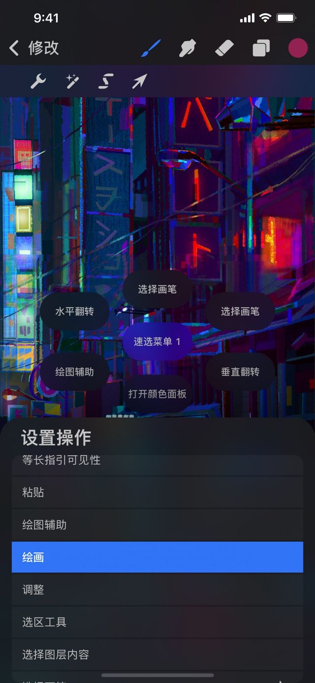 你可以依个人需求将这些按钮变更成 Procreate Pocket 中的功能工具。呼唤 速选菜单 后,轻点按住你想更改的按钮,一会儿后即会出现 设置操作 菜单;在选项清单中滑动并轻点你想要设置的按钮。