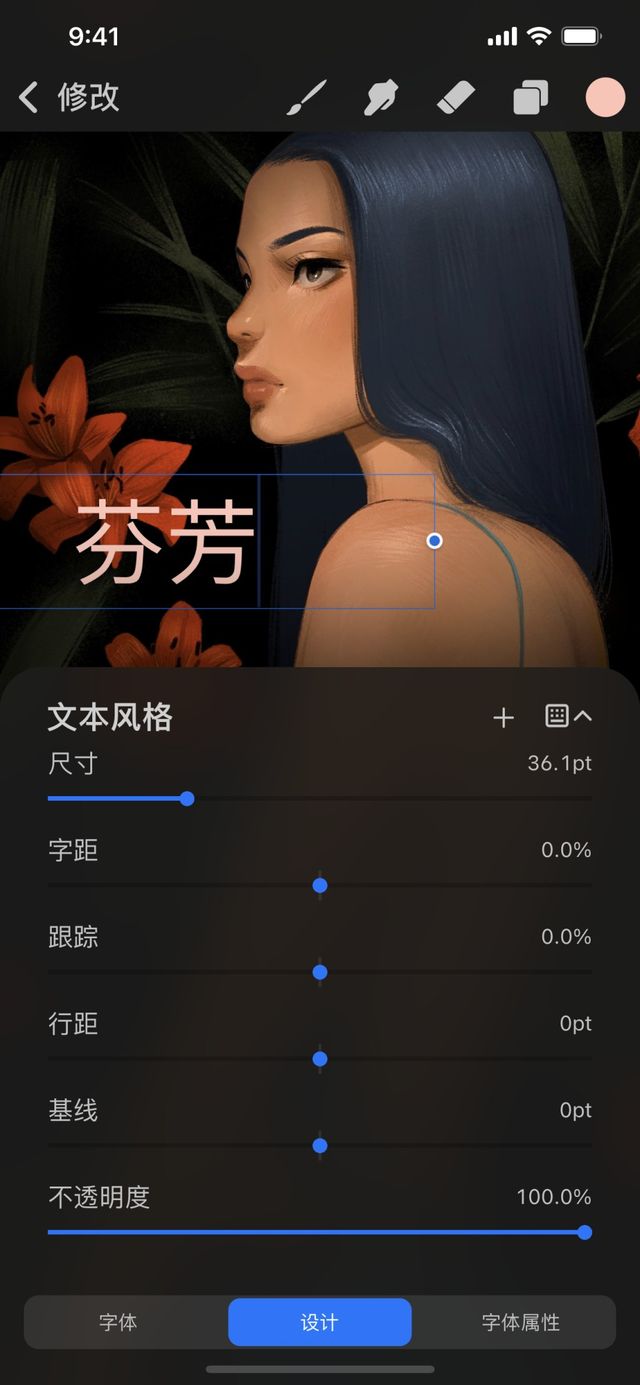 用与设计相关的滑条变更文本尺寸、字偶和字符间距、及其他字形属性。