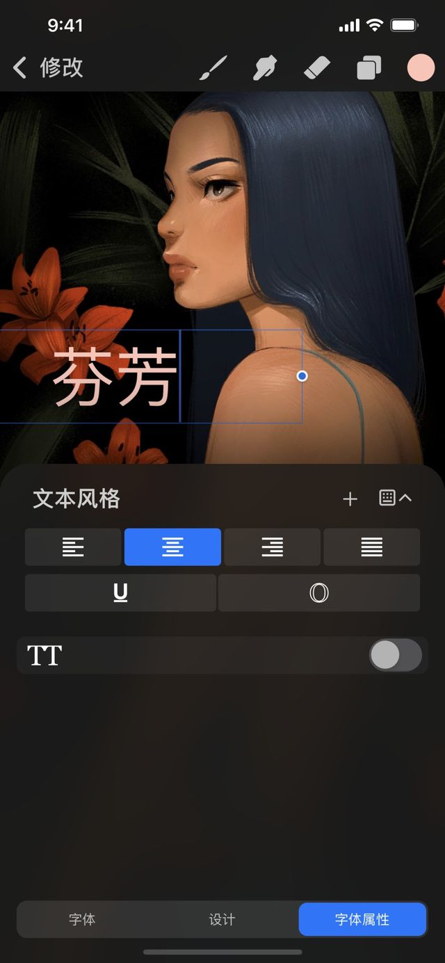 从 字体 清单中轻点任一个字体即能在 样式 栏中看到相应的可用字形样式;轻点样式以套用。