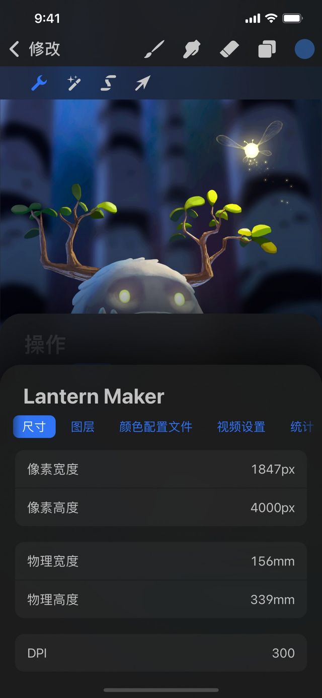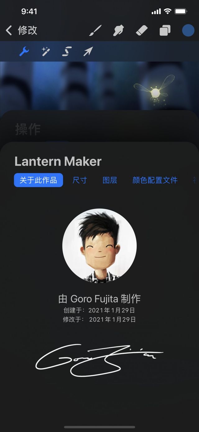 你能为你的作品手写签名并附上头像;此信息将会嵌入于你的 .procreate文件 中,当他人在 Procreate Pocket 点开你的图像时,他们将会在 画布信息 中看到你的署名信息。