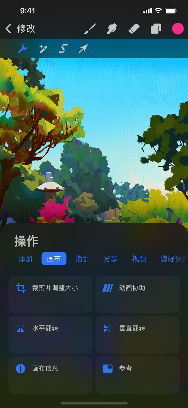 利用这个简单易懂的菜单颠覆你的画布设置;裁剪、调整尺寸和翻转画布,体验强大的动画协助或查看作品的详细技术信息。