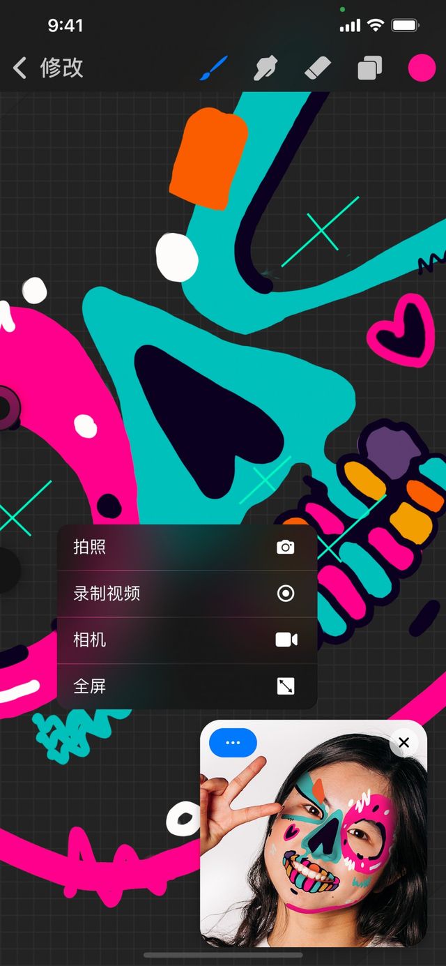 轻点 修改 > 操作 > 画布 > 参考 > 面容 按钮启用你 iPhone 上的前置摄像头并通过增强现实技术,将画布上的内容实时反映而包覆在你的面容上。