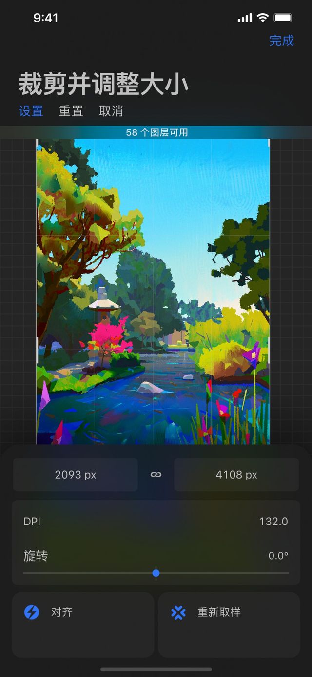 当你轻点 修改 > 操作 > 画布 > 裁剪并调整大小 后,在裁剪并调整大小界面中的对齐贴合功能会自动启用。