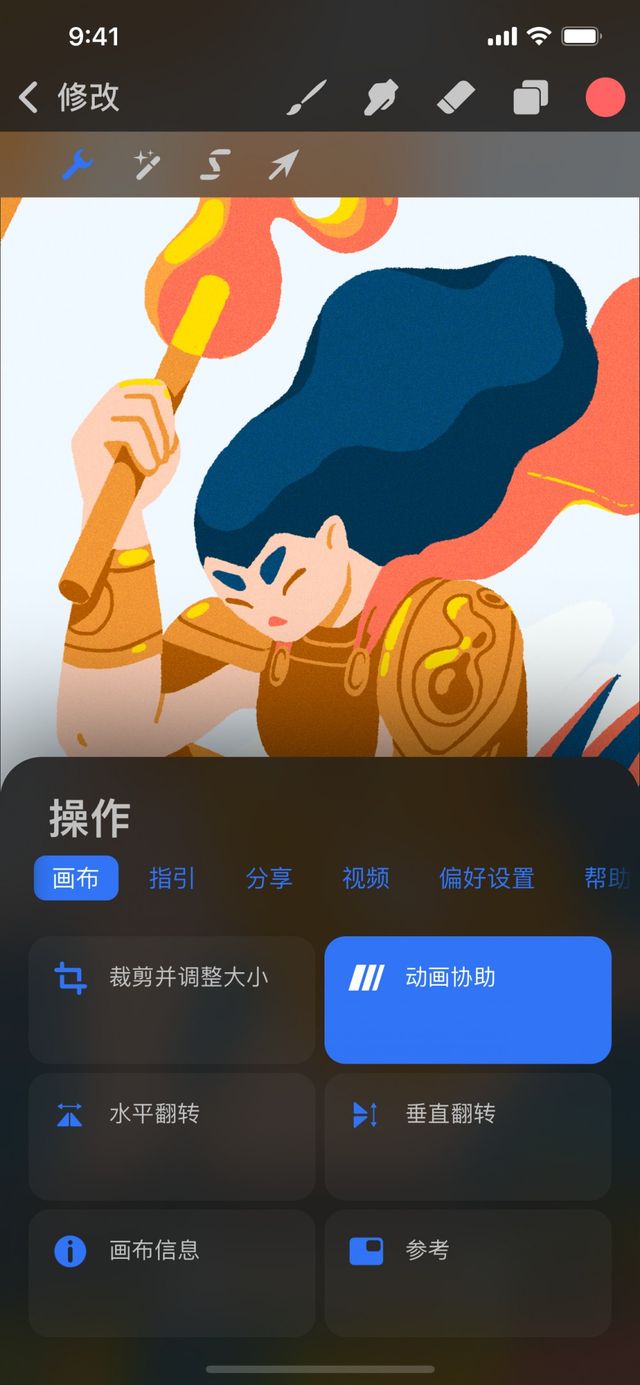 轻点 修改 再接着点选左上角扳手图标进入 操作 菜单,选择 画布 接着轻点 动画协助。