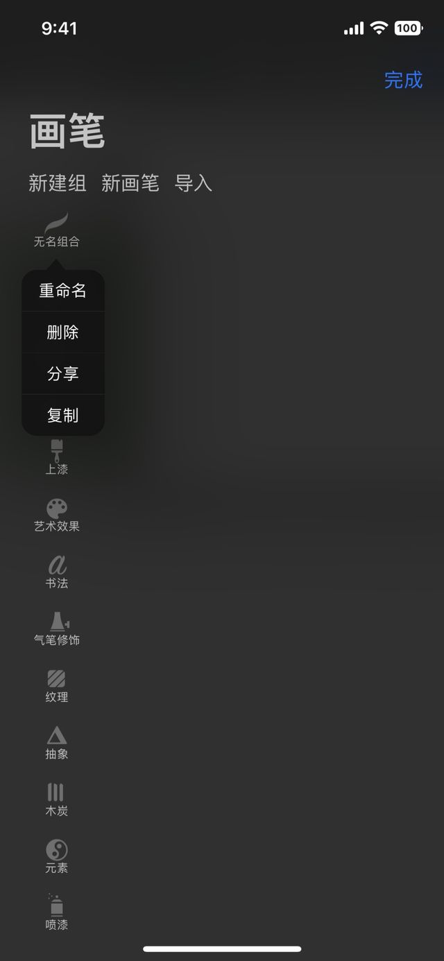在画笔库中轻点 新建组 即能在清单最上方新增新画笔组。
