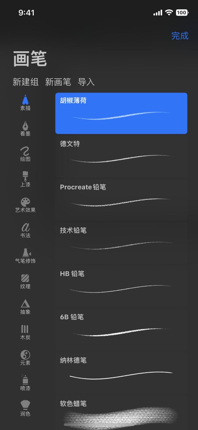轻点一个 画笔组 来浏览画笔,画笔清单中显示每支笔刷的名称和笔划预览;拖动清单来浏览、轻点一支画笔以选定,再轻点 完成 按钮回到画布即可开始创作。