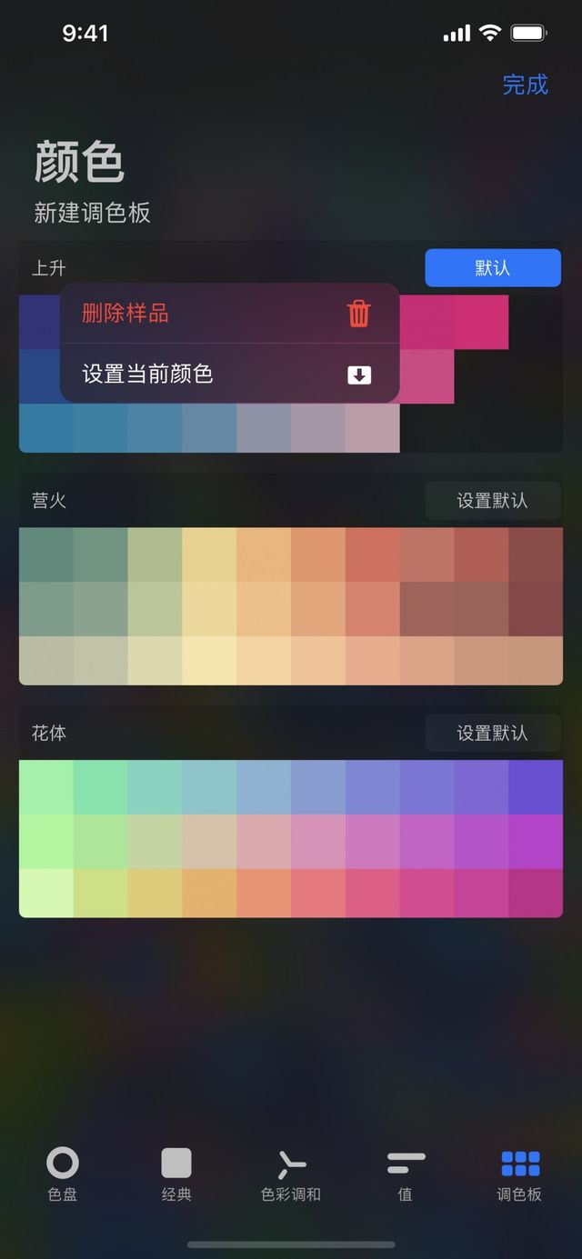 轻点并长按该色卡、再轻点 删除 即可从调色板中删除颜色;该色卡将会消失并留下空白色卡格。